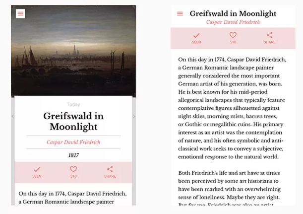 Мечтаете наконец-то начать разбираться в искусстве или уже начали интересоватьс знаменитыми картинами? Тогда это приложение создали именно для вас! Каждый день вам будет представлено произведение классического или современного искусства с кратким пояснением. Приложение доступно для платформ Android и iOS.