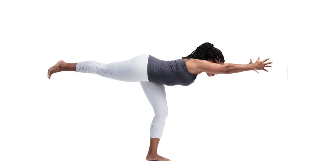 Станьте прямо, а затем вытяните назад левую ногу, натягивая носок. Держите вес своего тела на правой ноге, с акцентом на центр стопы. Вытяните руки вперед или назад вдоль тела и начните наклоняться, пока ваше тело не будет полностью параллельно полу. Смотрите вниз и следите за тем, чтобы спина оставалась максимально прямой. Задержитесь в этой позе на пять полных вдохов, а затем вернитесь в исходное положение.