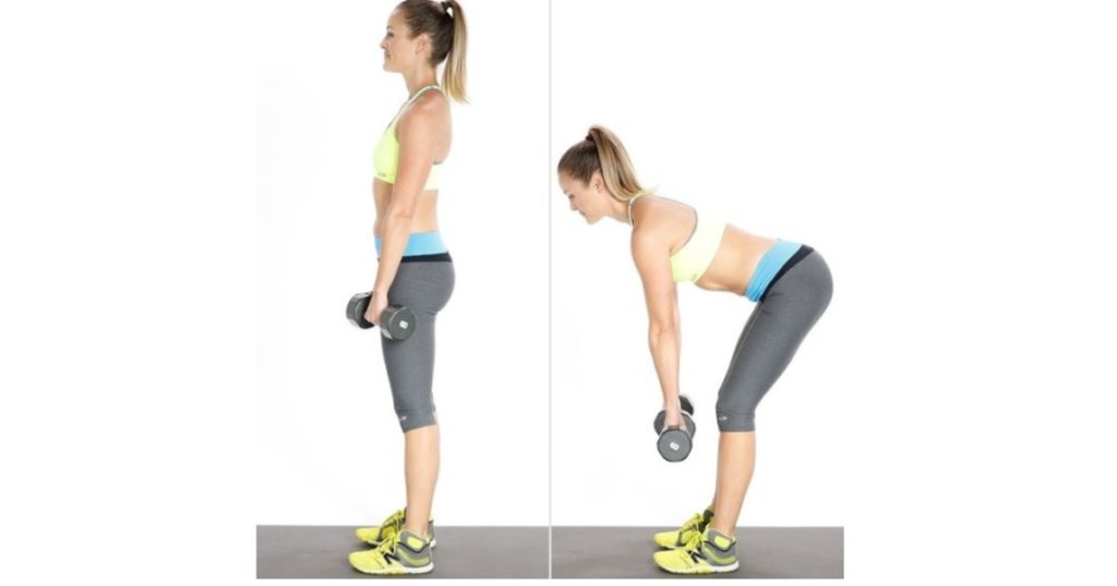 Станьте прямо. Возьмите в руки гантели и держите их перед передней поверхностью бедер на вытянутых руках. Выполняйте наклони вперед с прямой спиной, не сгибая колени. Повторите 10 раз в три подхода.