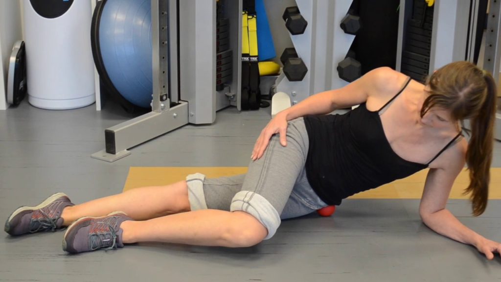 Просто лягте на живот, поддерживая себя на локтях. Подтяните правую ногу к груди, но при этом разверните ее в сторону. Поместите теннисный мяч под левое бедро и положите носок левой ноги на пол для упора. Используйте пальцы ног, чтобы толкать себя вперед и назад, раскатываясь на верхушке мяча. Не торопитесь, когда вы закончите, смените ноги.