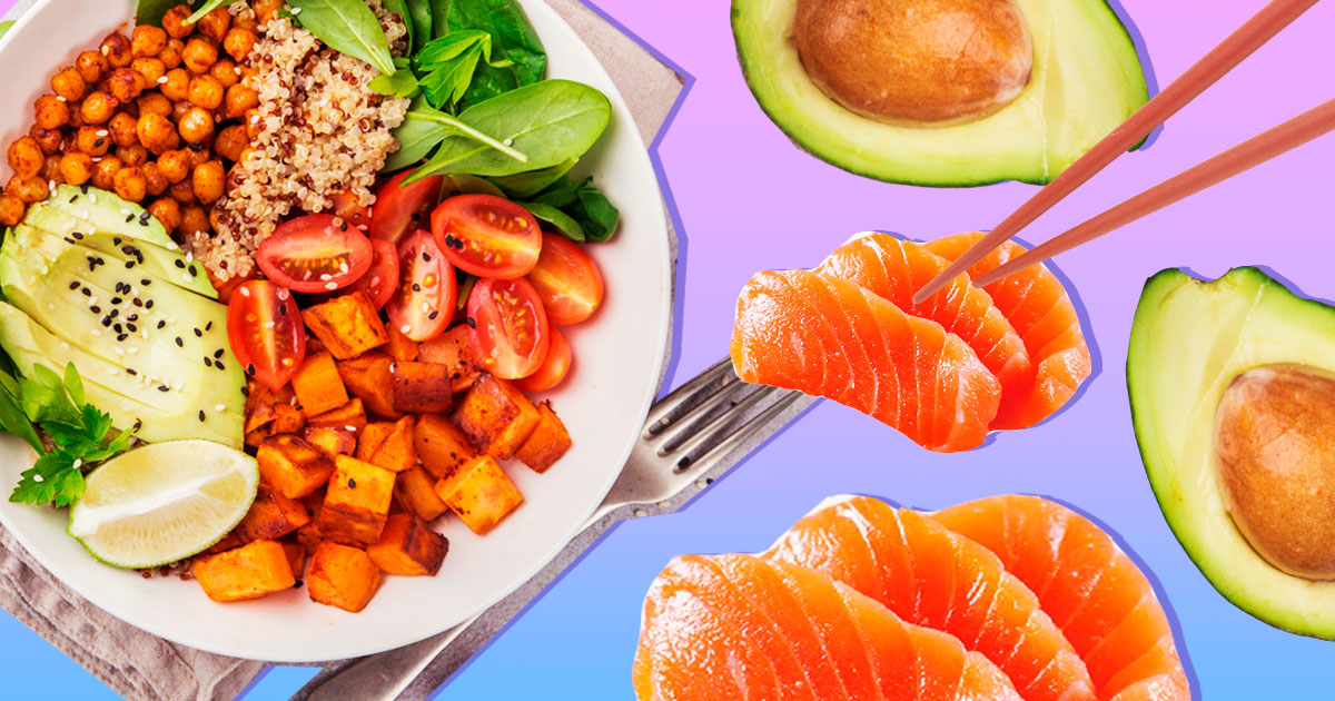 В данном варианте вместо бобовых можете использовать белковые продукты животного происхождения. Если покупать мясо, рыбу, морепродукты и птицу хорошего качества (без гормонов, выращенные в хороших условиях или вообще в дикой природе), то лучше этим продуктам надо оставить место в рационе. Они — источник многих макро- и микроэлементов, которых мало или совсем нет в растительной пище. К примеру, йод, селен, хром, витамин D и А, железо… В базу берутся те же принципы, что и в веганском боуле: крупа — заправка — овощи — топпинг. Однако растительных ингредиентов в боул сверху можно выложить кусочки рыбы, курицы, говядины или различные морепродукты. Кроме того, подойдут отварные яйца или яйца, сваренные в мешочек.