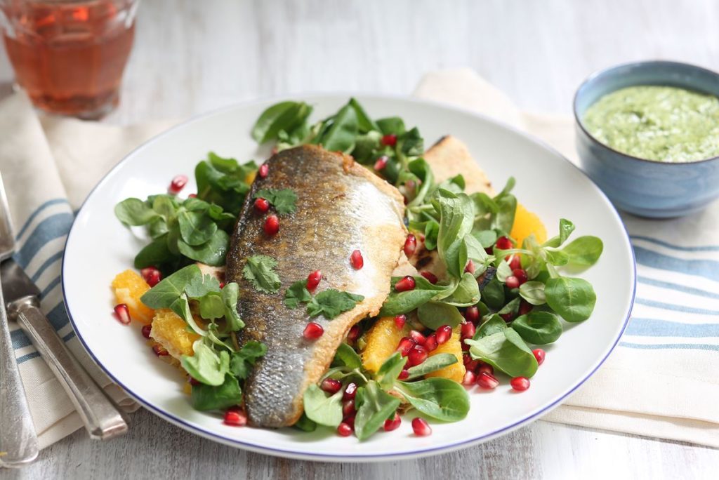 Возьмите зёрна граната, половину отложите, а из другой выжмите сок (для этого возьмите толкучку для пюре и надавливайте на зёрна). Смешайте в тарелке гранат с мелко нарезанным репчатым луком. Измельчите и добавьте в смесь зелень кинзы. В отдельной миске перемешайте сок лимона, приправку и оливковое масло. Помойте сибас, тщательно очистите от внутренностей. Посолите и поперчите. Переверните рыбу на одну сторону и сделайте на ней несколько надрезов. Обильно смажьте рыбу внутри и снаружи маслом.