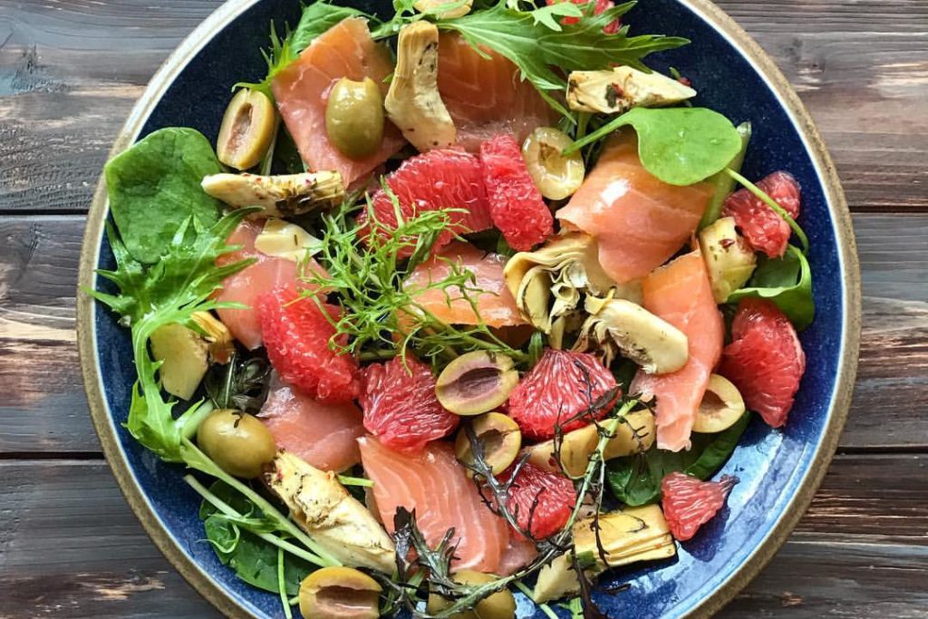 Возьмите миску с соком грейпфрута, добавьте в неё масло, мёд, сок лимона, соль. Взбейте блендером. Если его нет, подойдёт венчик. Заправка готова. В другую миску добавьте филе грейпфрута, артишоки, листья салата, сёмгу, оливки с миндалем. Распределите по салату заправку. Перемешайте, но не надавливайте. Добавьте соль и перец.