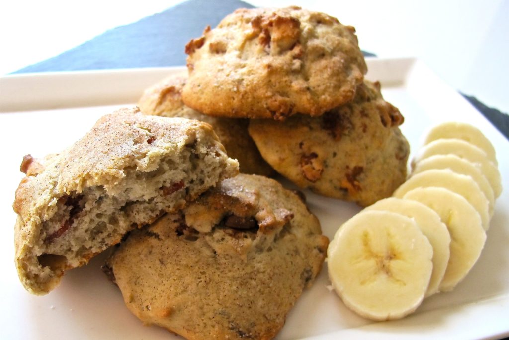 Смешайте сахар, яйцо и масло. Добавьте корицу, разрыхлитель и просеянную муку. Добавьте щепотку мускатного ореха. Очистите бананы и нарежьте их кружочками. Измельчите в блендере, чтобы получилось пюре. Измельчите грецкие орехи, добавьте их в тесто, добавьте также банановое пюре. Тщательно перемешайте ингредиенты. Возьмите форму для запекания, расстелите пергаментную бумагу. Используя кулинарный мешок (переложите в него тесто), выдавите тесто на форму в виде кружочков. Разогрейте духовку до 180 градусов. Переместите форму в духовку на 15 минут. Спустя это время достаньте печенье, остудите, чтобы они не были такими горячими, и можете подавать на стол.