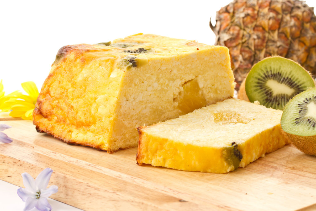 Растопите сливочное масло. Смешайте яйца и сахар, хорошенько их перемешайте (венчиком). Затем добавьте манную крупу, масло и творог. Снова тщательно перемешайте ингредиенты. Возьмите лимон и снимите с него цедру (поможет мелкая тёрка). Нарежьте фрукты и добавьте их в тесто. Добавьте также цедру, всё перемешайте.