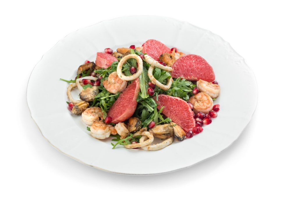 Мякоть нарежьте на небольшие кубики. Возьмите лук и нарежьте его на тонкие кольца. Нарвите листья фризе, добавьте в миску лук-шалот, руколу. Полейте второй половиной заправки. Перемешайте с огурцом. Выложите получившийся салат по тарелкам (количество порций получится 4-6). Распределите креветки и украсьте дольками грейпфрута. Также вверху посыпайте зернышки граната. Подавайте сразу же.
