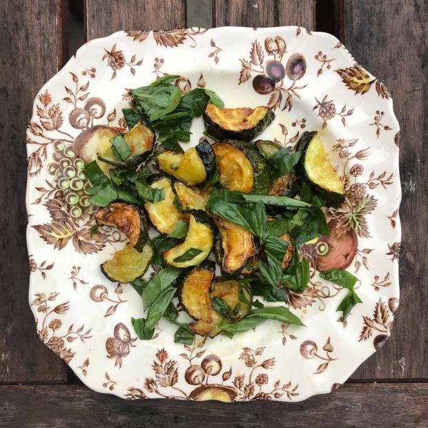 Разогреть духовку до 200 градусов. Нарезать кольцами цуккини. В форму для запекания налейте масла, положите цуккини и выпекайте по 10 минут с каждой стороны. Затем выложите цуккини в миску, порвите базилик. Приправьте солью, перцем и чили. Залейте все лимонным соком.