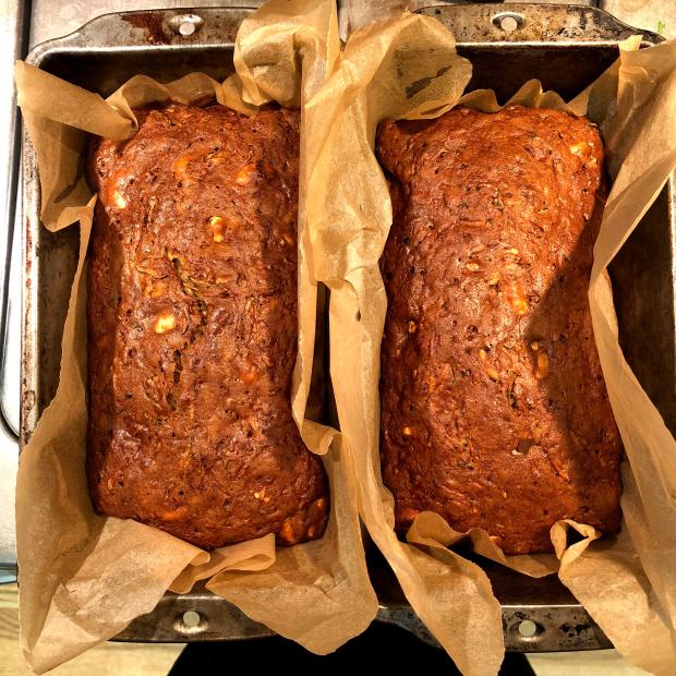 Разогреть духовку до 175 градусов. Смазать две формы для выпекания маслом и уложить пергамент. Взбить три яйца в большой миске до светлого цвета и пушистого вида. Взбить вместе все ингредиенты, кроме муки и орехов и цуккини. Затем добавить и все остальное, перемешать до получения однородного теста. Налейте тесто в формы и посыпьте двумя столовыми ложками коричневого сахара поверх них. Выпекать в течение часа или до тех пор, пока зубочистка не станет чистой.