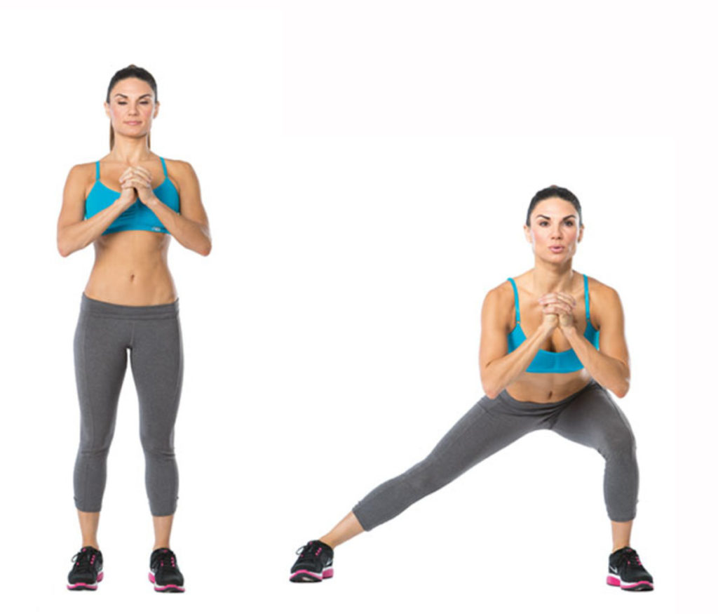 Боковые выпады позволяют проработать внутреннюю поверхность бедра и средние ягодичные мышцы. Кроме того, работают икры, мышцы поясницы и пресса. Для выполнения упражнения встаньте прямо, держа гантели в согнутых руках над плечами. На вдохе сделайте широкий шаг правой ногой в сторону, слегка сгибая колено. Приседайте до прямого угла в колене, затем возвращайтесь в исходное положение. Сделайте 12 повторений на каждую сторону.