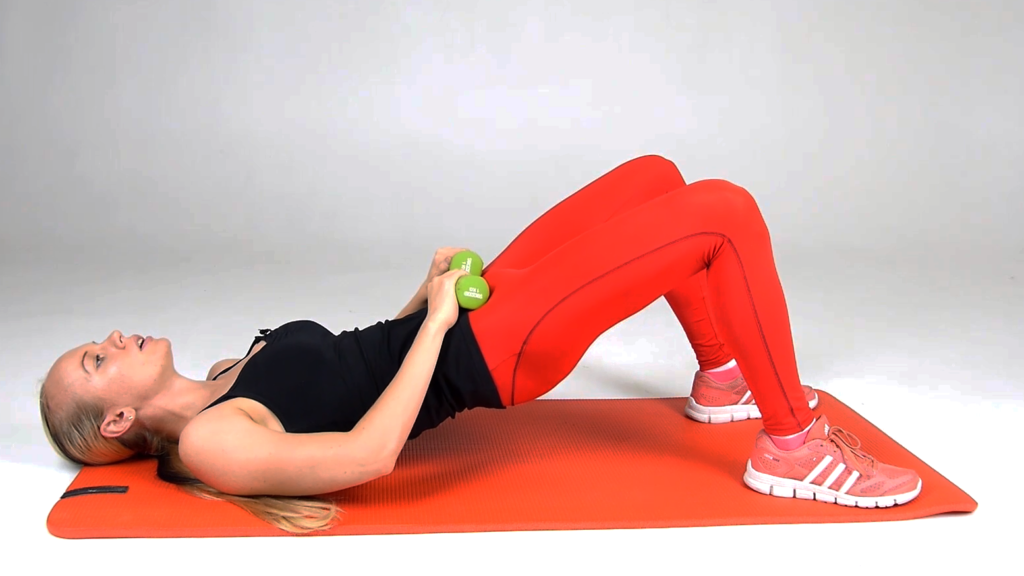 Это упражнение способно придать скорректировать форму ягодиц, подтянув мышцы. Для его выполнения необходимо лечь на спину, согнув колени. Положите гантели на бедра для отягощения, поставьте ноги на ширину плеч и медленно поднимайте бедра параллельно полу, напрягая ягодицы. Ваше тело должно образовывать одну диагональную линию от плеч до колен. Повторите упражнение 12 раз.
