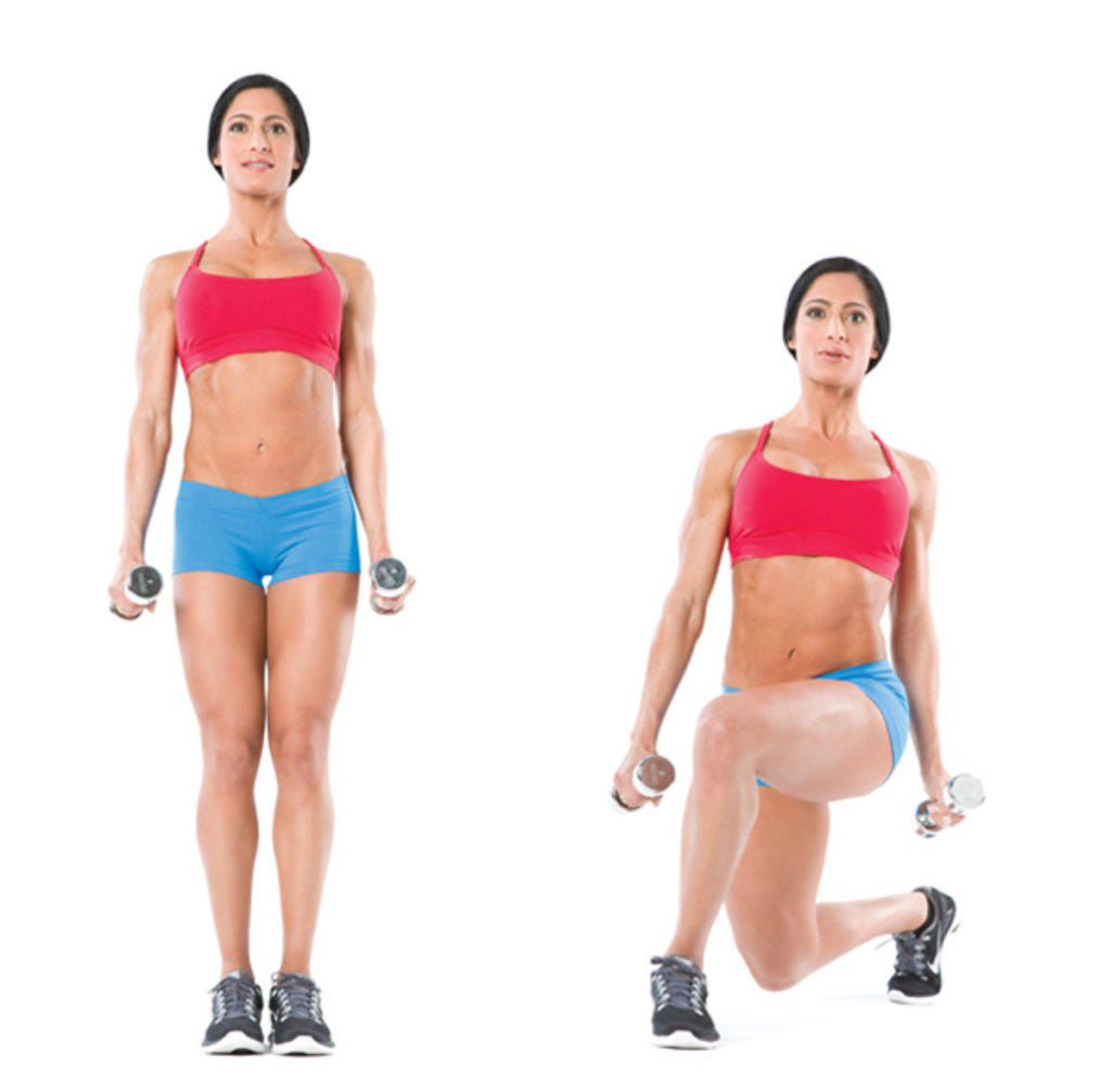 Регулярное выполнения приседаний-реверансов помогает сформировать округлые подтянутые ягодицы. Для выполнения этого упражнения поставьте ноги на ширине плеч, держа гантели в опущенных руках. Сделайте широкий шаг по диагонали в сторону опорной ноги, опустите колено рабочей ноги пока оно не коснется земли, при этом колено опорной ноги должно быть согнуто на 90 градусов. Вернитесь в исходное положение, затем повторите упражнение 12 раз.
