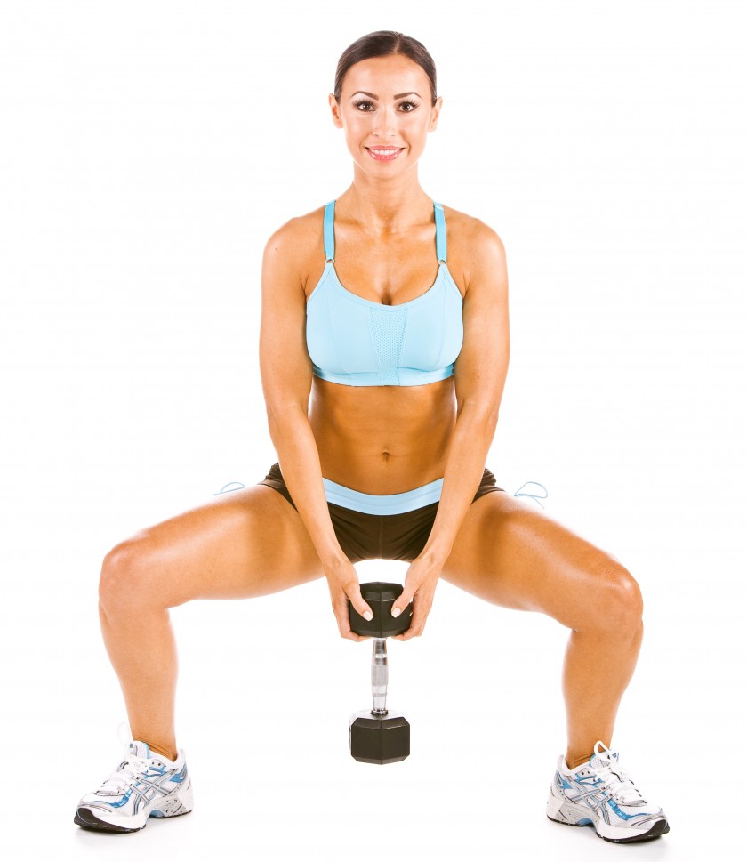 Преимущество приседаний сумо с весом — прокачка ягодиц и внутренней части бедра. Для выполнения этого упражнения поставьте ноги чуть шире плеч носками врозь, опустите руки перед собой, удерживая гантели. На вдохе, отклоняясь вперед приседайте до того уровня, когда ваши бедра окажутся параллельны полу. Таз отводите назад, а колени держите в одной плоскости с носками. На выдохе возвращайтесь в исходное положение. Повторите упражнение 12 раз.