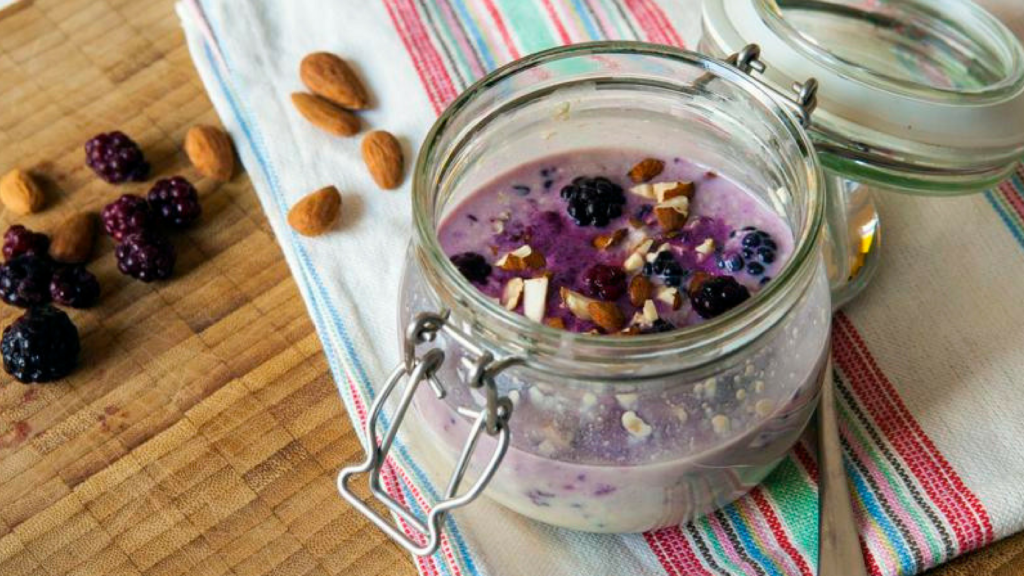Все ингредиенты кроме ягод смешайте. Поставьте в холодильник на ночь. С утра добавьте ягоды. Можно еще украсить орехами или сухофруктами.