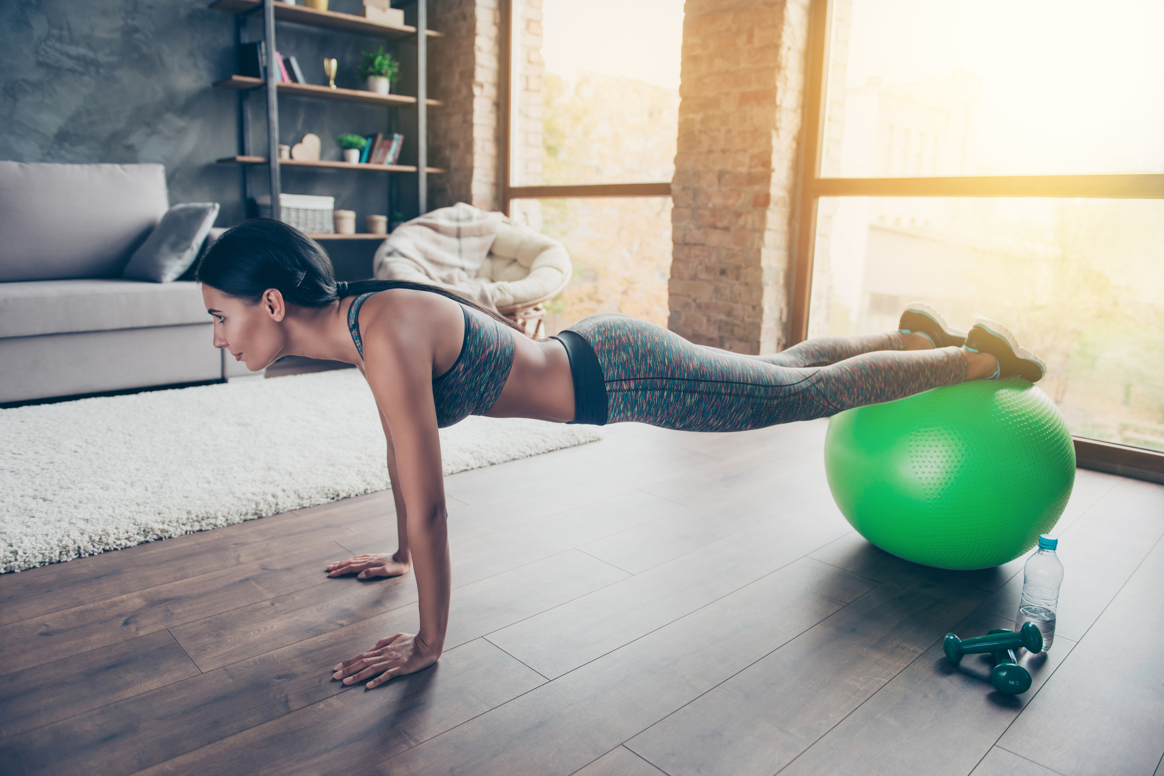 Для этого упражнения вам понадобится фитнесбол. Примите положение, как будто собираетесь отжиматься. Руки находятся на полу, а стопы – на фитнесболе. Ноги согнуты в коленях. Начните тянуть колени к груди (катая к себе фитнесбол), стараясь не поднимать вверх бёдра. Затем вытяните ноги назад, полностью их распрямив. Вернитесь в исходное положение. Сделайте от 10 до 15 повторений.