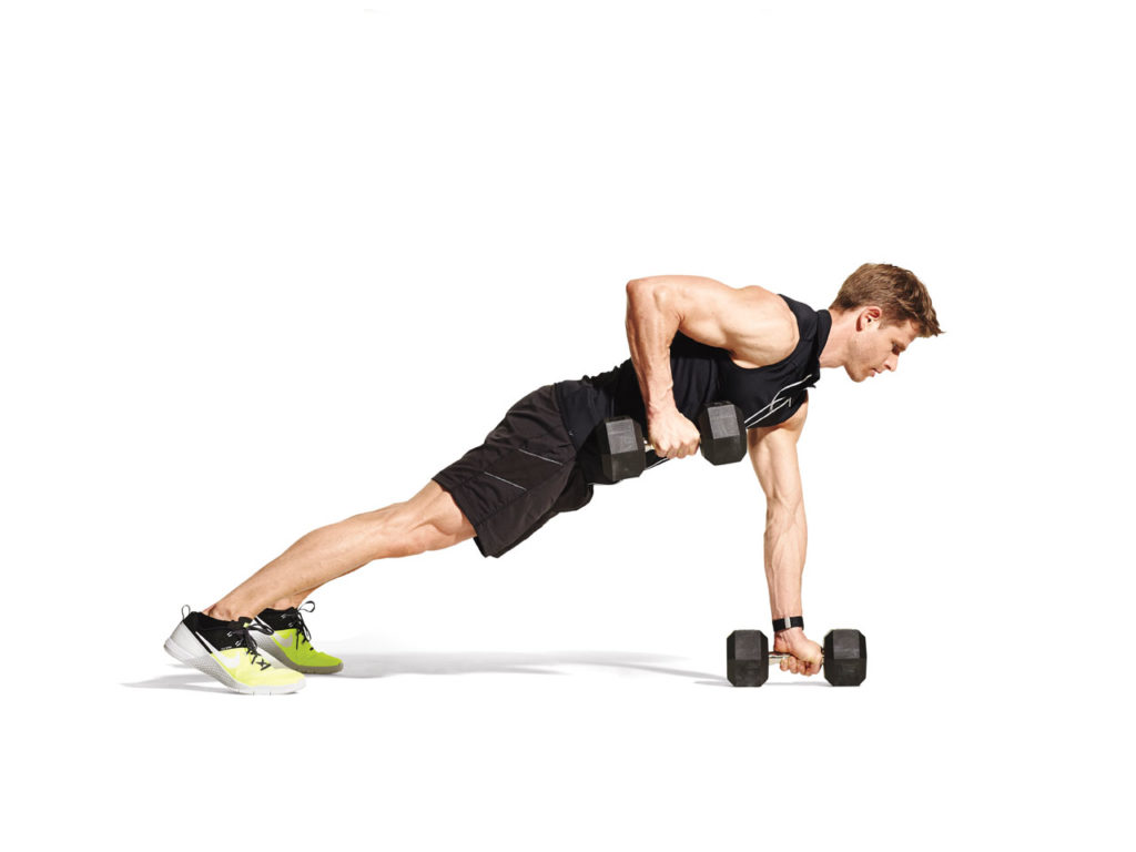 Исходное положение – как во время отжимания, но руки должны держать две гири (или гантели) и опираться на них. Не поднимайте высоко бёдра, тело должно представлять собой прямую линию. Пятки не касаются пола. Поднимите гирю одной рукой, затем опустите её. Поднимите другую гирю. Сделайте от 6 до 8 повторений. Когда вы захотите увеличить нагрузку, делайте от 12 до 15 повторений с каждой стороны.