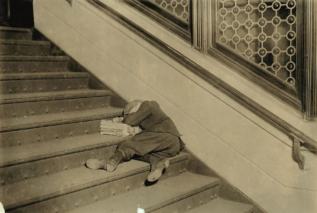 6. Мальчик спит на лестнице с газетами, которые продает.
