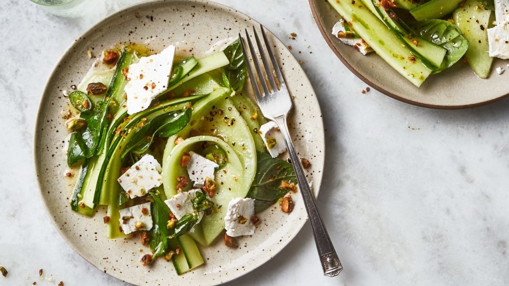 Фисташки поджарьте на сухой сковороде. 2 столовые ложки орехов мелко нарезать. Остальные отложить. Нарезанные фисташки смешать с мелко нарезанными чили, уксусом и медом. Взбить это все блендером, добавить соль и перец. Нарежьте слайсами огурцы и дыню. Все смешайте в одной миске, приправьте соусом и добавьте листья базилика. Перемешайте.