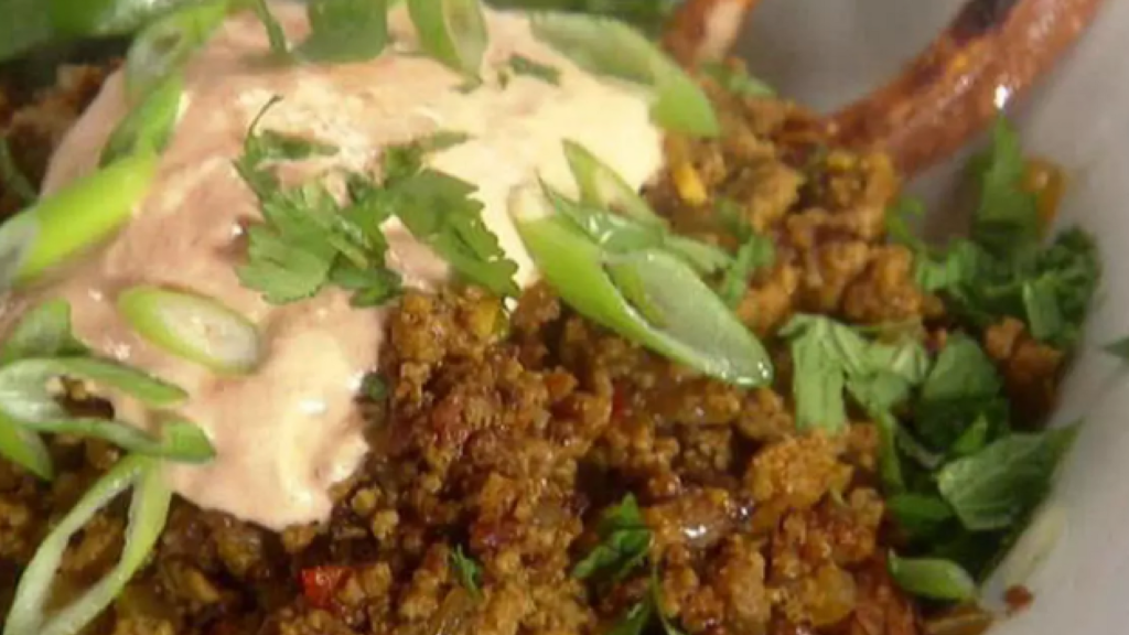 Оливковое масло прогрейте в казане, положите туда фарш, разомните и подрумяньте. Добавьте чеснок, перец чили, лук, имбирь, молотый чили, кориандр, тмин, куркуму, немного соли и перца. Готовьте в течение пяти минут, добавьте томатную пасту и продолжайте готовить еще минуту. Влейте к фаршу бульон и доведите до кипения.