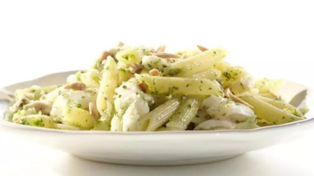 Сварите пасту в подсоленной воде до состояния аль денте. Всю воду после варки не сливайте, оставьте стакан. Смешайте пасту с водой из кастрюли, соусом и половиной запеченной рыбы. Подавайте, украсив оставшейся рыбой и миндалем.