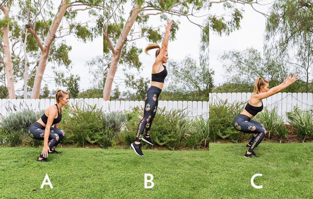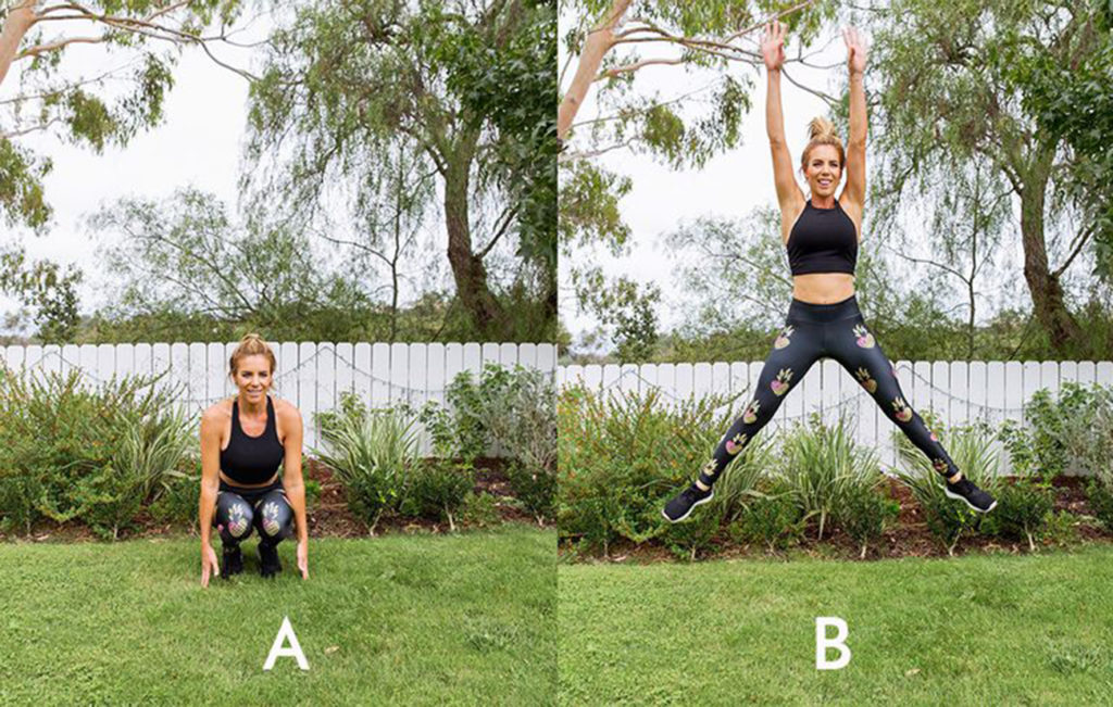 Поставьте ноги шире уровня бедер, немного развернув носки. Приседайте, опуская руки к полу. Оттолкнитесь на пятках и пальцах ног и прыгните вверх и вперед, поднимая руки вверх. Приземляйтесь мягко и старайтесь подпрыгнуть вверх и вперед на пару шагов. Сделайте 20 повторений.