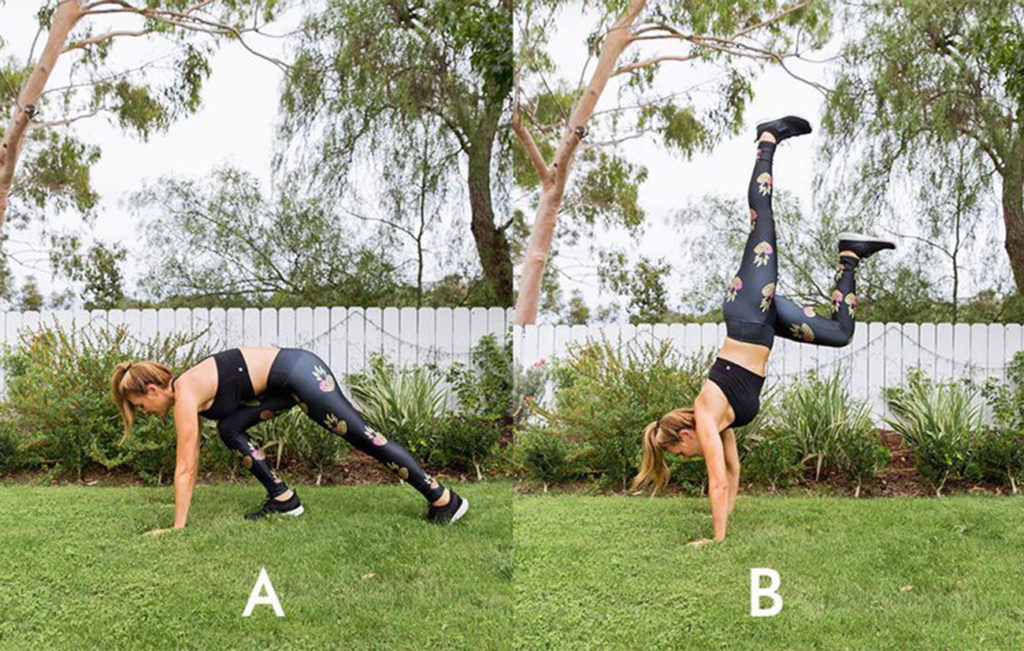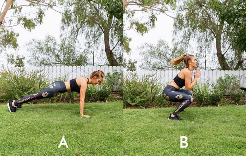 Начните с высокой планки с плечами, расположенными над запястьями, задействовав при этом корпус и слегка прогнув копчик. Согните колени и поднимите ноги за пределы ваших рук, чтобы приземлиться в приседании. Подтолкните себя на руках, чтобы поднять бедра и прыгнуть обратно в планку. Сделайте 15 повторений.