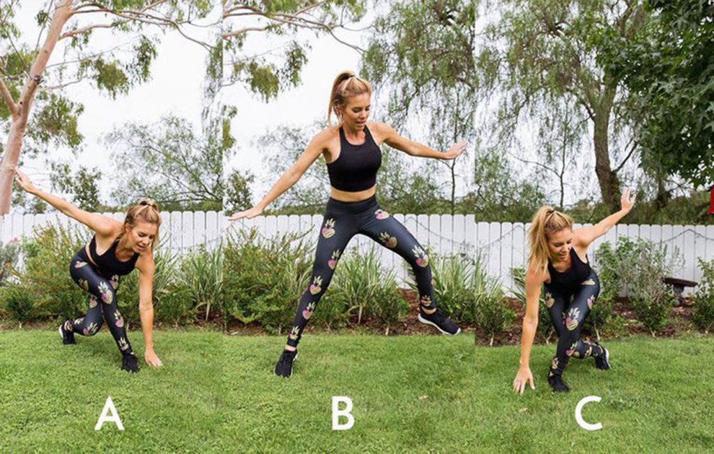 Начните с приседания, поставив левую ногу по диагонали за правой ногой. Левой рукой коснитесь пола. Подпрыгните вверх и в сторону, чтобы сменить ноги, затем мягко приземлитесь правой ногой за левую ногу. Это один повтор. Продолжайте быстро перемещаться из стороны в сторону, сделав 20 повторов.