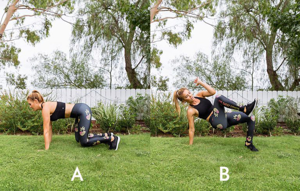 Начните в позе стола, удерживая колени в воздухе над полом. Поднимите правую ногу под своим телом, поднимая левую руку с пола и открывая ее в левую сторону. Поднимите правое колено к левому локтю, затем вернитесь в начальную позу. Это один повтор. Делайте 20 повторений, каждый раз меняя стороны.