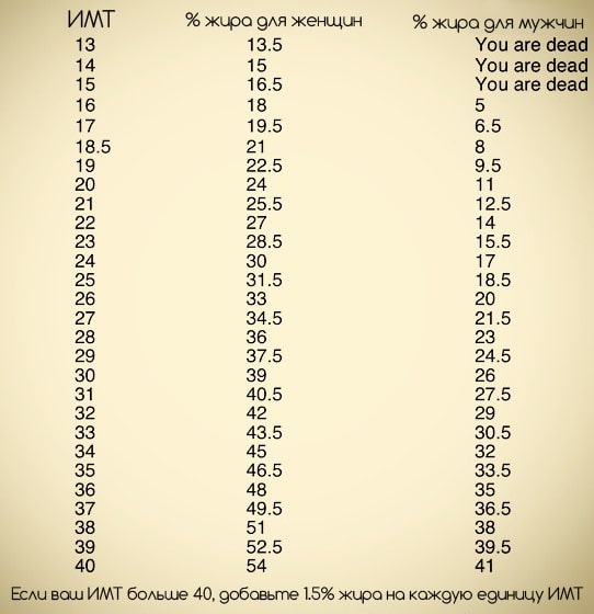 Есть много способов определить процент жира в теле, но мы приведем пример определения по индексу массы тела от Лайла Макдональда. Этот метод подходит только для нетренированных людей, которые только начали заниматься в спортзале и у них нет видимых мышц.