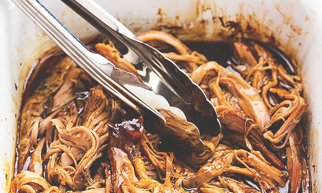 Взбейте вместе уксус, воду и следующие шесть ингредиентов. Добавьте измельченную свинину на сковороду. Налейте соус на мясо. Накройте крышкой и готовьте в течение 4-5 часов.
