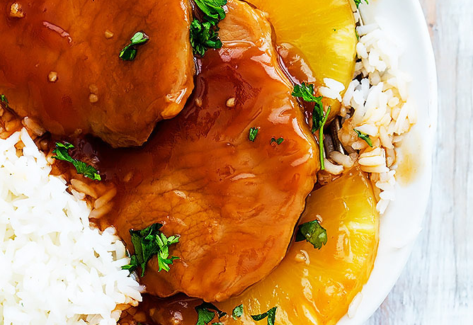 Взбейте вместе соевый соус, коричневый сахар, кетчуп, жидкость из банки ломтиков ананаса (за исключением ананаса), уксус и чеснок. Взбейте вместе холодную воду и кукурузный крахмал до растворения. Добавить в смесь соуса. Слегка смажьте сковородку или мультиварку маслом. Налейте половину смеси соуса. Поместите свиные отбивные вместе с кусочками ананаса. Вылейте оставшийся соус сверху. Накройте крышкой и варите сначала на большом огне, потом на медленном в течение 3-4 часов. Подавать свиные отбивные с рисом.