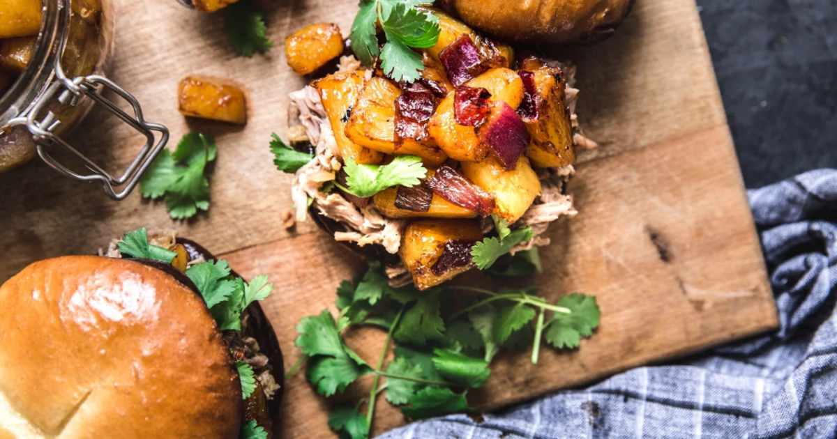 В сковороду добавьте все ингредиенты для приготовления свинины, соль и перец. Тушите часа 3. Затем закарамелизируйте ананаса. Намажьте булочки соусом и соберите бургер.