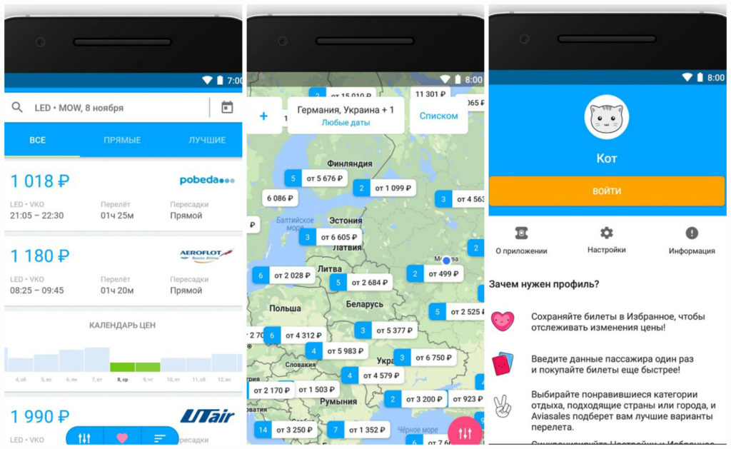 У самостоятельных путешественников пользуется популярностью сервис Aviasales. Приложение можно установить на смартфоны на базе Android, iOS, Windows Phone. Полезных функций у программы множество, скачать ее для поиска самых дешевых авиабилетов по нескольким сотням авиакомпаний можно бесплатно. Приложение купить билеты на самолет с телефона в любой точке мира. А самым экономным туристам Aviasales предлагает отслеживать динамику цен, искать самые дешевые предложения.