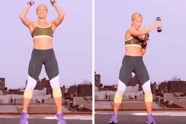 После 10 секунд отдыха поставьте ноги на ширине плеч, гантели держите на уровне груди. Сделайте диагональный удар одной рукой, затем другой. Делайте это в течение 20 секунд. После 10 секунд отдыха повторите оба упражнения (8 кругов).