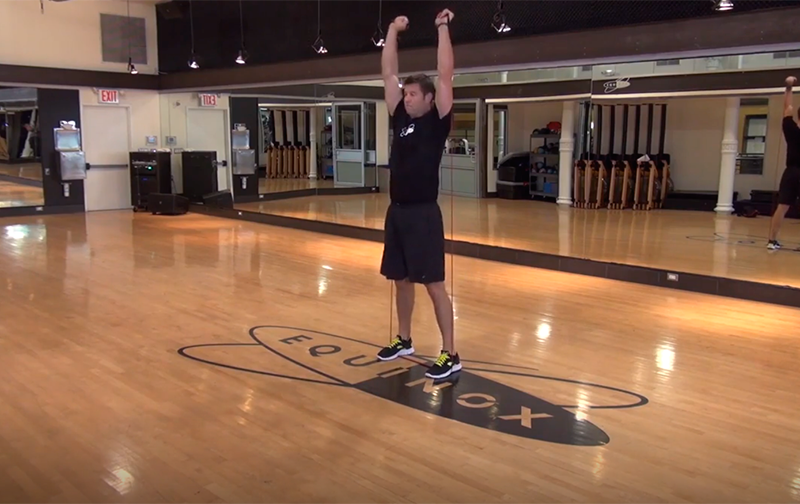 Зафиксируйте эспандер на шведской стене или другой прочной опоре на уровне груди. Возьмите каждую ручку (ладони внизу) и сделайте шаг вперёд левой ногой, расположив руки на уровне груди. Сделайте жим от груди, чтобы руки были полностью выпрямлены. Сожмите мышцы груди. Вернитесь в исходное положение. Сделайте 12-15 повторений.