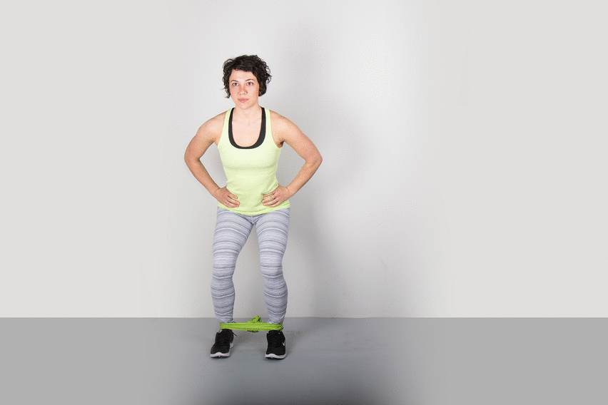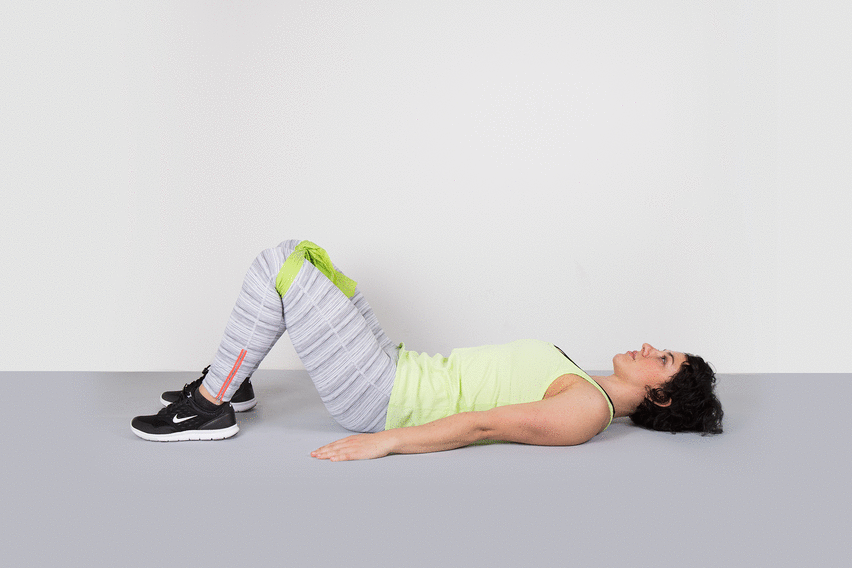 Обвяжите ленту вокруг ног прямо над коленями. Лягте на спину, поставив стопы на пол на ширине плеч и согнув колени до 90 градусов. Поднимите бёдра вверх, чтобы плечи, бёдра и колени образовали собой прямую линию. Сжимайте ягодицы на протяжении всего упражнения. Сделайте от 15 до 20 повторений.