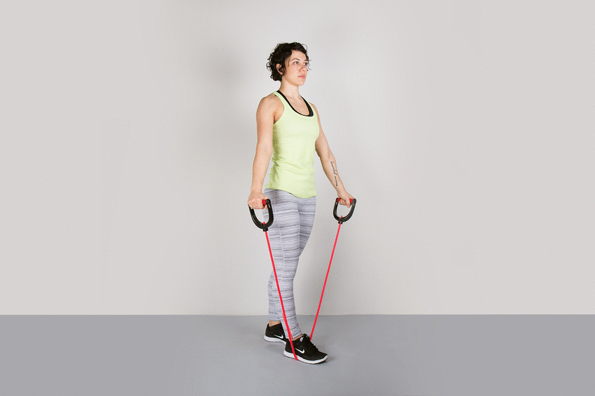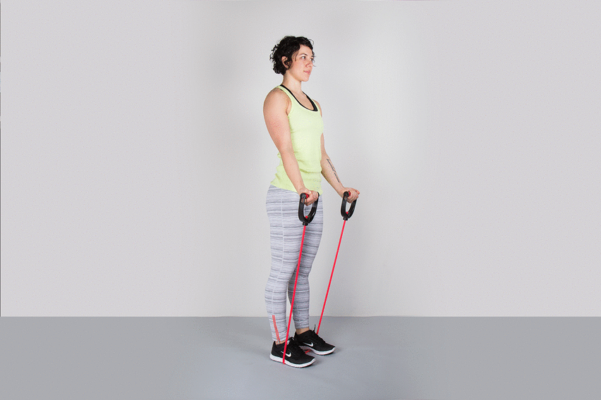 Встаньте, поставив ноги на ширине плеч, ступни на середине эспандера. Возьмите ручки ленты. Руки прямые и опущены вдоль туловища, ладони обращены вверх. Потяните руки к плечам, сгибая их в локте. Медленно опустите вниз и сделайте в общей сложности от 12 до 15 сгибаний.