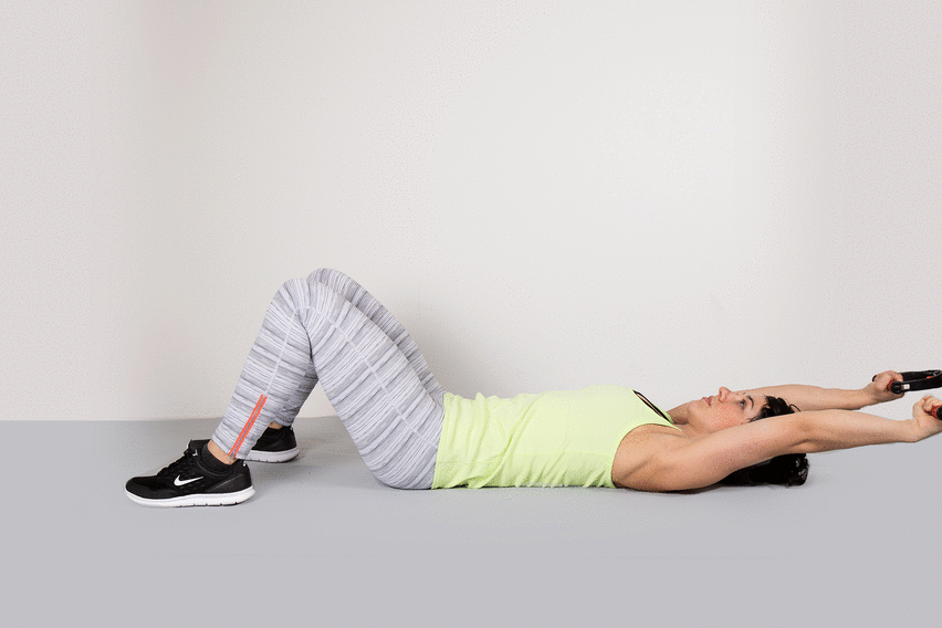 Закрепите эспандер с помощью фиксатора к стене в нижнем положении и пристегните концы эластичной трубки или нескольких трубок к двум ручкам. Затем лягте на спину, взяв ручки и вытянув руки над головой. Слегка согнув руки в локтях, потяните ленту к себе, вдоль туловища, пока ручки не достигнут колен. Медленно вернитесь в исходное положение. Сделайте 8-10 повторений.