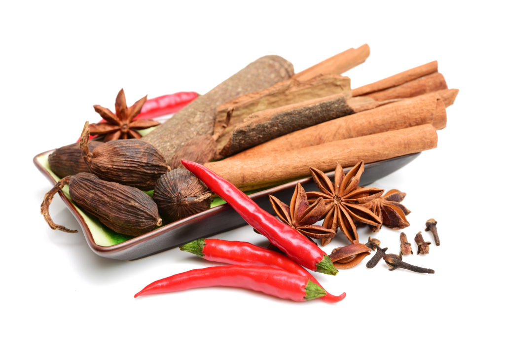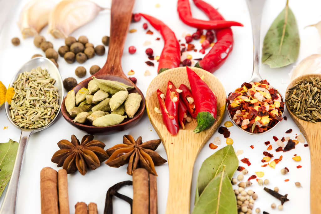 Душистый перец, кардамон, кайенский перец, гвоздика, семена кориандра, тмин, можжевельник, мускатный орех, паприка, розмарин, шалфей, куркума.