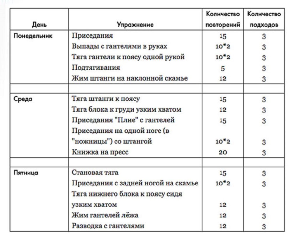 Пример таблицы с графиком и планом тренировок на неделю: