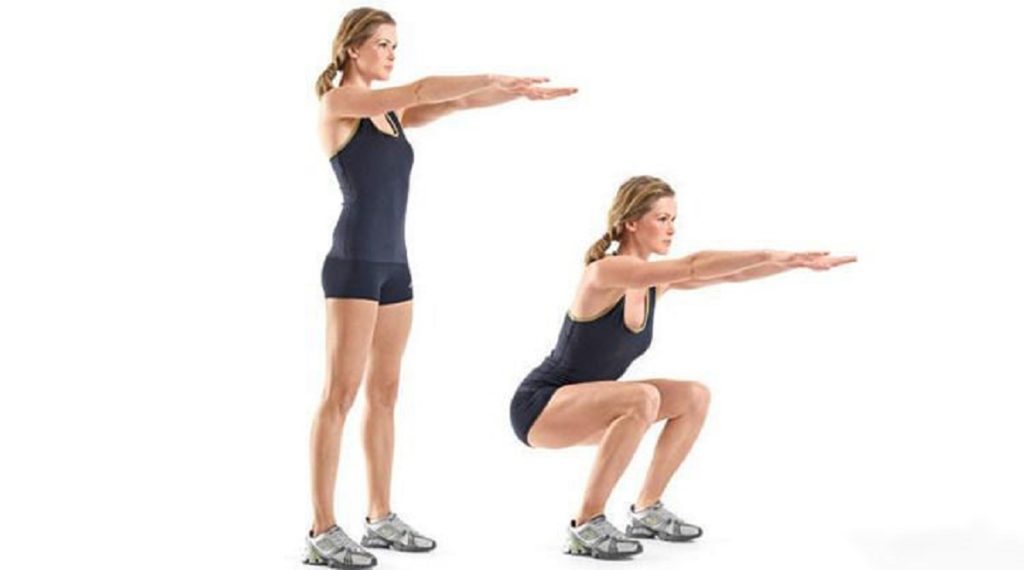 Сначала можно приседать без веса, затем – со штангой или гантелями с общим весом 5 килограмм. Приседать нужно 10-15 раз в 3 подхода. В исходном положении стоять нужно прямо, ноги на ширине плеч. Приседать до момента, пока бедра не станут параллельны полу. Следите, чтобы колени не выходили за линию носков.