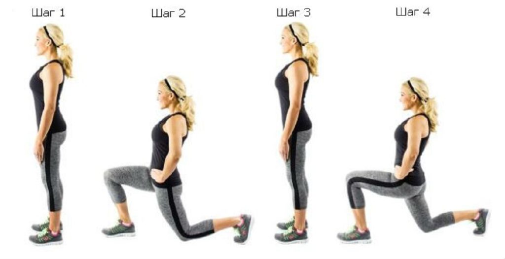 Для каждой ноги выполняйте по 15 выпадов в 3 подхода. Исходная позиция – стоим ровно, в руках гантели. Делайте шаг вперед и приседайте так, чтобы угол в колене составил 90 градусов. Потом выпрямляйтесь.
