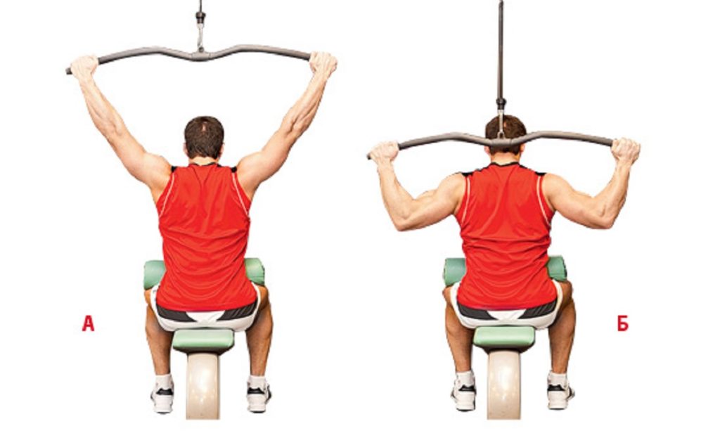 Используйте минимальный вес, выполните 2 подхода по 30 повторений. Садитесь на скамью, берите перекладину широким хватом. Выпрямьтесь и согните руки, работайте лопатками, спину сохраняйте прямой.