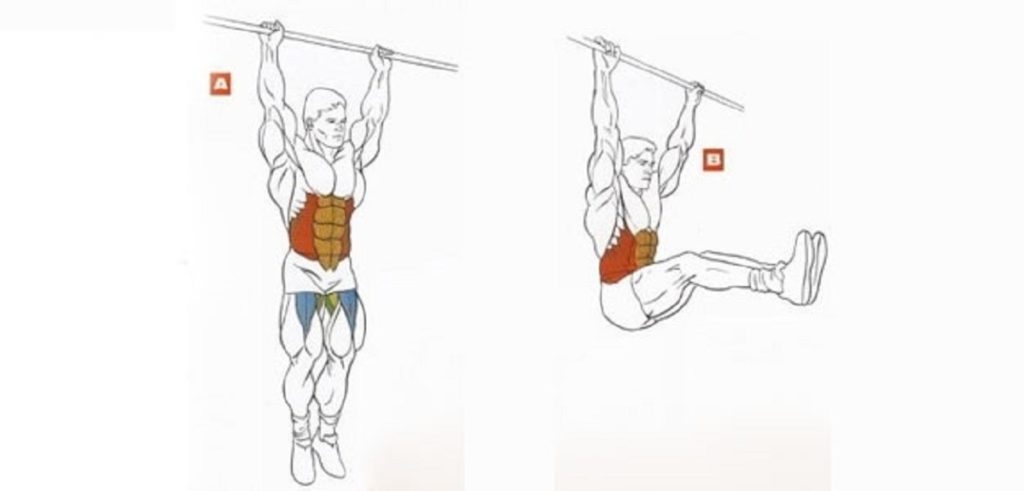 Нужно ухватиться руками за перекладину и подтягивать согнутые ноги к животу. Выполните 3 подхода по 15 раз. Когда привыкните, можно усложнить задачу, и поднимать прямые ноги перпендикулярно корпусу.