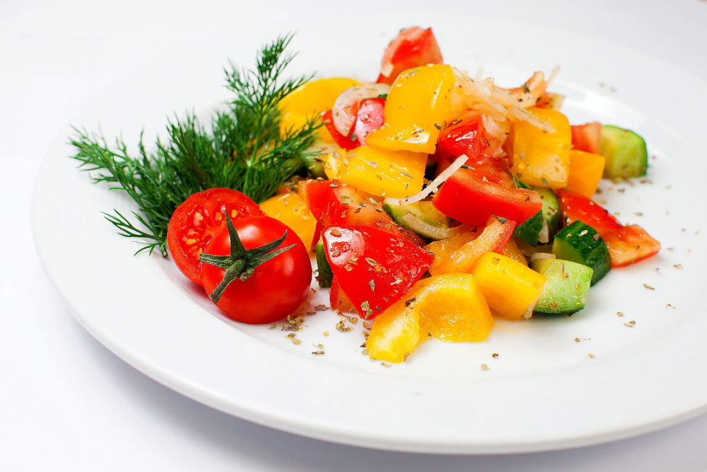 Витаминный салат из овощей (морковь, зелень, перец, помидоры, огурцы капуста) с добавлением оливкового масла, сока лимона или яблочного уксуса можно приготовить в любом офисе, где есть кухня. А о полезных свойствах данного блюда можно говорить вечно.