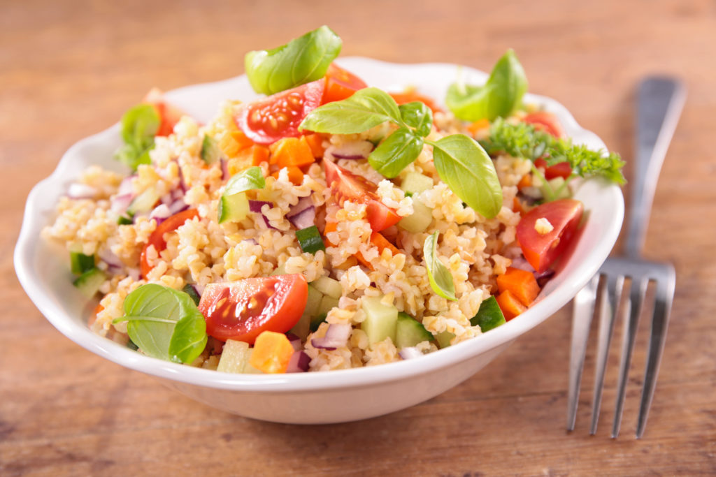 Довести бульон до кипения, снять с огня, залить им кус-кус, накрыть крышкой и отставить на 5 минут. В сковороде на оливковом масле обжарить цуккини и красный лук. Смешать вместе все ингредиенты, посолить, поперчить.