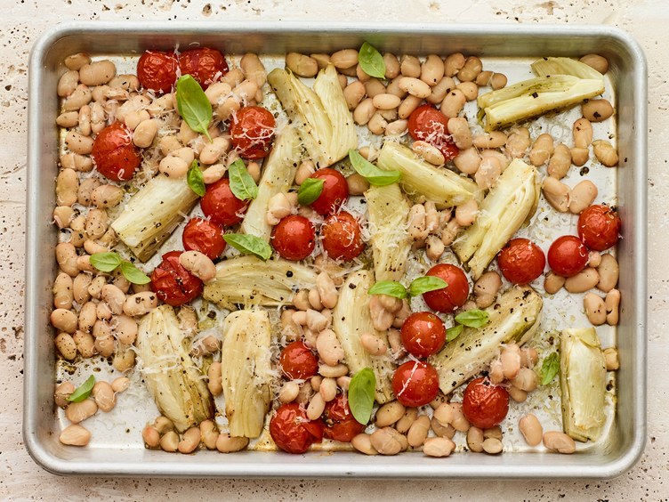 Включите духовку, чтобы разогрелась до 200 градусов. Застелите противень бумагой для запекания. На противень уложите фенхель, разрезанный на четверти, помидоры черри и сбрызните оливковым маслом, посолите и поперчите. Запекайте в течении 25 минут. Затем, добавьте бобы и базилик, слегка потрясите противень, чтобы содержимое перемешалось. Запекайте еще 10 минут, затем достаньте противень из духовки и дайте постоять 5 минут. Разложите блюдо в тарелки, посыпьте пармезаном и подавайте.
