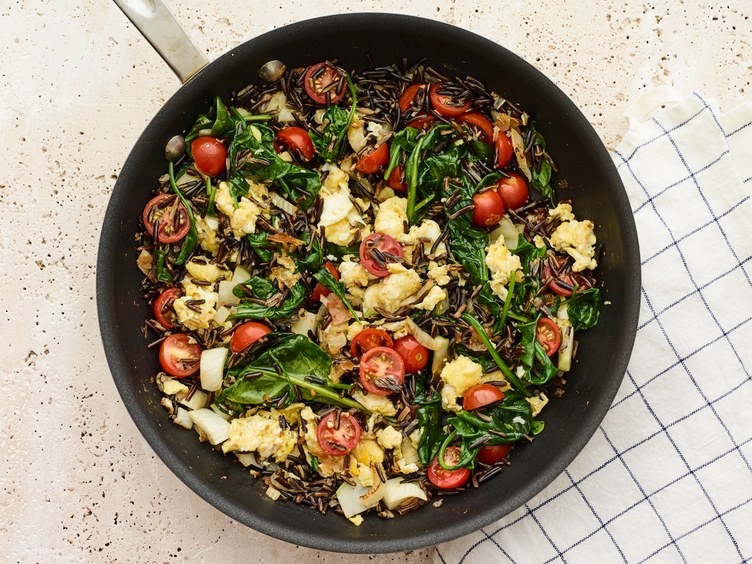 Добавьте в сковороду еще половину ложки оливкового масла, положите нарезанный фенхель и готовьте около 3 минут, пока он не размягчится и не начнет подрумяниваться. Добавьте шпинат и перемешайте. Затем, добавьте рис, помидоры и готовые яйца. Перемешайте смесь, чтобы рис прогрелся, и все компоненты соединились. Снимите с огня, посыпьте базиликом и пармезаном и подавайте.