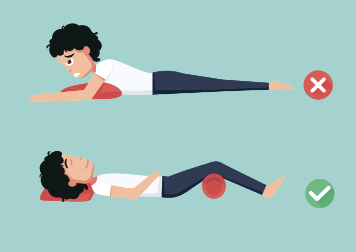 - Лучшая позиция – на спине. Идеально будет, если вы подложите под колени валик или подушку, ведь это поможет вам снизить нагрузку на спину, расслабит поясницу, благодаря чему вы почувствуете себя лучше.