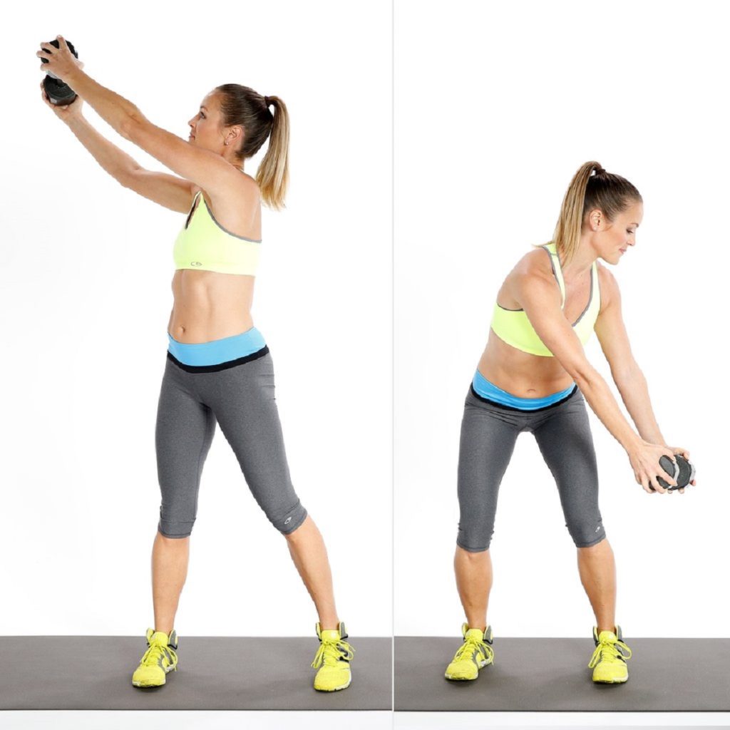 Расположите ноги на ширине плеч и возьмите в руки гантель. Поднимите ее над левым плечом и диагональным движением перенесите вес к правому бедру. Во время выполнения упражнения ваши руки должны быть выпрямленными.