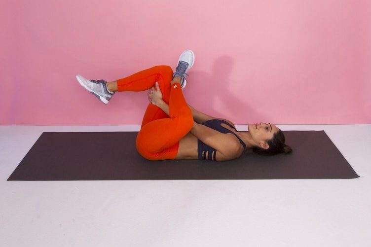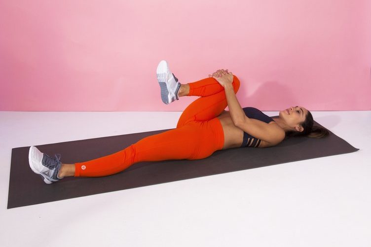 Лягте на спину, вытянув обе ноги. Согните правую ногу в колене и потяните к груди. Нижнюю часть спины прижмите к полу. Задержитесь в этом положении на 30 секунд-2 минуты. Повторите на другой ноге.